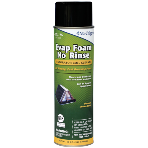 Evap Foam will liquefy dirt, grease, oil, and other residues quickly and easily. Since it is fortified with corrosion inhibitors, it is safe for use on metals and other materials. The product s fast-breaking foam is completely self-rinsing. Simply spray Evap Foam on the coil and the foam will wash the emulsified matter off. The aerosol product is NSF registered* for use as a coil cleaner in and around food processing areas, and helps leave the area deodorized with a pleasant lemon scent.